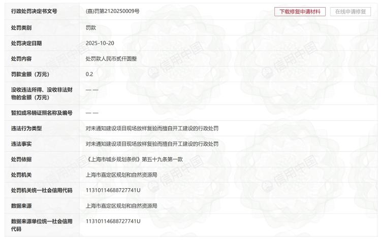 海报新闻记者赵恩上海报道。据信用中国网站消息,上海润哲祥云置业有限公司近期新增8份行政处罚报告,共被罚款1.6万元。处罚决定日期为10月20日,处罚机关为上海市嘉定区规划和自然资源办公室。上述详细信息表明,上海润哲祥云置业有限公司的违法行为是在未通知施工现场重新验收的情况下开工建设。处罚依据是《上海市城乡规划条例》第五十九条第一款。根据《上海市城乡规划条例》,新建、改建、扩建工程现场打桩后,建设部门或者个人必须通知部门规划管理小组重新验收,并按规定报告开工日期。未将新的检查情况通知规划管理部门而擅自施工的,规划管理部门将处2000元以下的罚款。资料来源:据中国信用天眼查官网显示,上海润哲祥云置业有限公司成立于2023年,是一家主要从事房地产行业的公司。公司注册资本56.2亿元,法定代表人王新义先生。海报新闻记者(记者微信ID:HaibaoNewsSw)查询发现,该公司此前曾因涉及安全生产事件的违法行为受到行政处罚。 2024年5月2日,嘉定区南翔镇甲贤路河沙路口西100米JDC2-0202单元33-02地块示范区商业办公下沉式庭院施工工地又发生爆炸,造成6人受伤。根据处罚信息,上海润哲祥云置业有限公司因未确保管理人员具备足够的安全生产知识和管理能力,示范区园林绿化工程分包商施工过程中缺乏安全管理,未取得下沉式庭院园林绿化工程施工许可证,对本次事故负有责任。该法违反《中华人民共和国安全生产法》第二十六条第一款、第二十七条第一款的规定。上海市嘉定区应急管理局对其处以罚款50万元。此外,2024年7月,该公司因未取得施工许可证拆除建设工程及建筑物,被上海市嘉定区建设管理委员会罚款35.94万元。