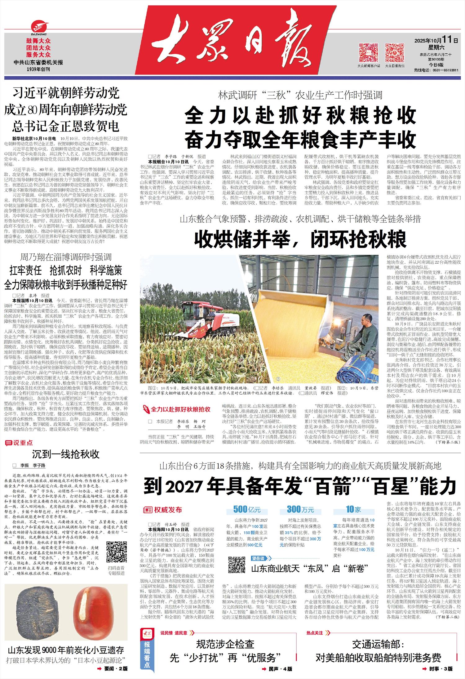 山东省将气象预警、排涝清淤、农机调配、粮食晒储等全链条措施融为一体,边收边晒边储,实现秋粮闭环丰收。图一:10月9日,肥城市安家庄镇朱家燕村秋收景象。(记者李培库、董小燕报道) 图二:10月9日,东营市东营区单家大棚农业合作社,工作人员在装干玉米储存。 (□通讯员苗红伟报道)□记者李培乐、杨科、李明、王浩琪 现在正值“三秋”重要生产时期,持续阴雨天气给秋粮收割、干燥和储存带来严峻挑战。连日来,山东省各地迅速落实气象预警、排洪清淤等全链条措施,部署农机具、粮食烘干仓储,全力以赴乘秋粮丰收之机,坚决打好农业生产“三秋”攻坚战。 “村民们,请小心,接下来四个小时雨就会停,小雨天适合收割玉米,大家赶快准备好农具,雨停了就到田里去。” 10月7日一早,肥城市石横镇乡村广播里反复播放催收玉米的声音。 “我们与气象局、农业局、农村局等合作,实时了解雨季和气候变化‘窗口期’,通过村播、微信群等渠道,发布了30多条预警信息和20多条收获指导,指导农民抓住雨季、小雨等收获时机。”d 马彦才,石横镇农业综合服务中心主任。为解决“机器入土困难,农作物易发霉”的问题,石恒振首先调整了泥地里6台履带式收割机的作业情况,从河南派来22台高性能收割机,加强收割设备。快速采摘和烘焙离不开物质支撑。石横市提前联系农产品供销合作社、经销商,重点保障燃油、编织袋、防水篷布、防水塑料布等物资供应,确保“供应充足、价格稳定”。针对连续降雨可能导致农田淹水问题,各地制定排水预案,组织党员干部和群众清田。排水沟、田间沟、道路沟等g 有计划地进行疏通和整改。截至目前,肥城市文阳市已完成沟渠疏浚修复18.9公里,修复清理桥涵200多座。 10月9日,广饶县乐安街道北竹坑村土游农业合作社附近的玉米地里,一辆履带式收割机正在冒雨作业。宽履带使其能够在泥浆中稳定运行,从而有效地撕下耳朵、剥皮并捡起盒子。然后,湿粮由履带式烘干拖拉机运送到合作社,形成无缝闭环的“田间烘干点”。北竹坑村党支部书记、合作社董事长张洪涛表示,合作社投资近70万元,安装了两座大型烘干塔和辅助设备,有效满足了村里及周边农户的烘干需求。自10月起,干燥塔开始24小时运行,因到持续降雨。 “目前,该村的农民已经完成了玉米的收割和烘干,合作社只剩下100亩左右还在收割。”由于秋雨持续,粮食物流企业满负荷运转,秋粮收割、干燥困难。夜以继日地工作,加快脱粒、烘干进度,确保秋粮及时安全入库。在东营七龙河生态农业科技有限公司粮食烘干车间,一座日处理能力300吨的烘干塔正在全面运转。收获的湿玉米经过脱粒、分级、去除杂质、干燥等工序,保持水分含量在14%以下。 “今年我们种植了 4500 英亩的玉米,大约已经收获了四分之一。”公司董事郭立宝表示,在秋粮丰收的关键时期,公司不能只顾自己的田ds,同时也为周围的农民尽自己的一份力量。为解决“烘干难”问题,利津县盐窝市政府与公司合作,主动开放烘干设备,向周边小农户免费提供秋粮烘干服务。 10月9日下午,在汶上县山东卓荣农业服务有限公司堆场,总经理路阳首先引导卡车排队卸粮,然后命令装载机将物资堆放、装车。烘干后的粮食直接转移到卡车上,运往附近的深加工企业。 “作为济宁市日烘干能力最大的烘干服务基地,我公司提供粮食烘干、仓储、销售等综合农业服务,目前每天收粮50至60车,烘干区域覆盖济宁市及周边地区,远方收割粮食“如安徽、河南等地。”陆阳介绍,目前收购的玉米水分达到28%至35%,一般烘干至14%才入库。但为了提高烘干效率,烘干标准暂时调整为15%至17%,烘干后的籽粒不再储存,直接送往加工企业。针对阴雨天气引发的玉米发芽、发霉等症状, 由于天气原因,该公司最近投资30万元推出了新颜色。分拣设备并分类采购,确保干燥质量。