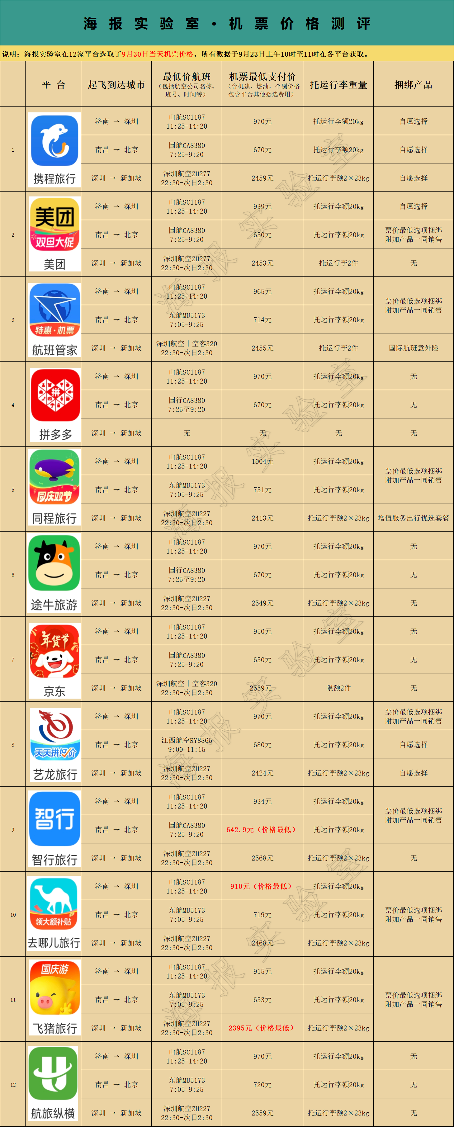 新闻记者Sunribin,Qin Wen,Li Jinshan和Du Zhengmin的报告随着国定假日的临近,旅游市场继续引起新的繁荣崛起,而且航空票的储备也已成为消费者护理的重点。最近,海报研究所随机选择了三条路线。我们评估了12个平台的门票销售价格,即Zinan神经,Nanchan Basing和深圳Singor,即Ctrip Travel,Meituan,Pinduoduo,Pinduoduo,Pinduodu Zhix Travel。歌曲。我们发现,每个平台在价格,销售等方面都提供不同的功能。 POSPE研究所从9月30日至9月23日选择了门票,评估了最便宜的门票的价格,主要是在城市的同一行程和售票价格上调整(无飞行和时间限制)。该措施是在全国范围内的假期期间旅行之前提供有关机票价格的全面信息,这允许提出MERS可以在许多平台上选择最合适的门票购买渠道,从而避免不必要的消费和误解。在Zinan Zhenzhen路线中,直接访问12个平台的最低价格是Shanhang SC1187的航班。库纳尔旅行平台提供的最低支付价格为910元,这使其成为这条路线上最实惠的选择。 The minimum payment price of this route on the Tongcheng travel platform is 1,004 yuan, since it is linked to a “relatively high flight guarantee gift package. The results of the Nancheng-Beijing route show that Air China CA8380 flight on the Zhixing travel platform enjoys a 65 yuan discount on the platform, with a price of pageor end of 642.9 yuan, offering the cheapest option for consumers. Tongchengel travel platform lower price for MU的这条路线是中国东部航空公司MU5173,最低支付价格在深圳 – 辛格帕尔的深层路线分类中相对较高。深圳航空公司ZH2277的最低付款价格已在Liandiao折扣平台上验证为60元,这使其成为最便宜的选择。该航班在两个平台上的最低支付价格,包括JD.com,AVZ和Zongheng,是2,559元,价格最高。关于分组产品的销售,包括Meituan,飞行经理,Tongcheng Travel,Yilong Travel,Zhixing Travel,Zhixing Travel,Qunar Travel和Fliggy Travel在内的七个产品以及其他具有较低费用选项的产品。其中有一些很容易欺骗消费者的任务,例如Meituan,Tongcheng Travel和Zhixing Travel。消费者应在购买门票时仔细验证价格结构。五个平台的部署票最低,包括Butler,Yilong Travel,Zhixing Travel,Qunar Travel和Fligy Travel,并不是该平台上最低的门票价格,最终支付价格。最低价格(不包括例如,在价格页面上显示了584元的燃油税),例如,从南香(Nanchan)到北京(Beijing)。如果您真的付款,则平台钥匙的会员服务,包括购买票务优惠券,酒店会员折扣等等。最终付款价格为763元,不是该平台购买门票的最低价格。经过比较和评论后,记者选择了没有包装服务的购买选项,最终付款价格为714元。必须有必要在Pinduoduo价值(没有国际航班),Tuniu Travel,JD.com和AV Travel Zonghengmasu评级路线上不包含销售。 Ctrip Travel,Meituan(Jinan-Shenzhen)和Elong Travel(Nancheng-Beijing,深圳 – 辛格布尔)选择是否购买以相同价格分组的产品。此外,在行李方面,这12条国家航线的费用为20公斤的行李支票。大多数国际路线检查2×23公斤的行李箱框架。