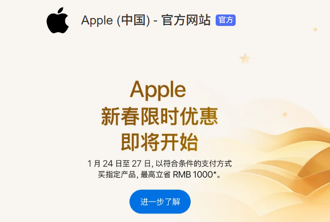 海报新闻记者 孙来宾报道 1月22日,苹果中国官网推出新年限时促销活动。 2026年1月24日0:1至1月27日23:59,用户可在指定期间内使用符合条件的支付方式购买iPhone、Mac、iPad、Apple Watch、AirPods以及苹果产品。搭配Pencil等产品,最高可省1000元,并享受最高24期免息分期,进一步减轻购买压力。此次优惠涵盖了多款热门产品,其中iPhone系列尤其引人注目。 iPhone 16或iPhone 16 Plus可节省300元,iPhone 16e可节省200元。对于寻求高性能笔记本电脑的用户来说,Mac系列还提供了丰厚的折扣。 14英寸和16英寸MacBook Pro(M4 Pro和M4 Max)以及15英寸MacBook Air(M4)可节省1000元。 14英寸MacBook Pro(M5)和Mac13英寸Book Air(M4)分别可节省800元和700元。 iMac 和 Mac mini 也将因此分别提供600元和400元的折扣。平板电脑领域,11英寸、13英寸iPad Pro(M5)、iPad Air(M3)可立减400元,iPad(A16)、iPad mini(A17 Pro)各立减200元。此外,Apple Pencil Pro 也参与促销,用户可以优惠 100 元购买。智能手表方面,Apple Watch Ultra 3、Apple Watch Hermès Ultra 3 优惠 300 元,Apple Watch Series 11、Hermès Series 11 优惠 200 元,Apple Watch SE 3 优惠 200 元。耳机产品中,AirPods Max售价高达300元,AirPods 4及支持主动降噪的版本售价100元,可以省下不少钱。