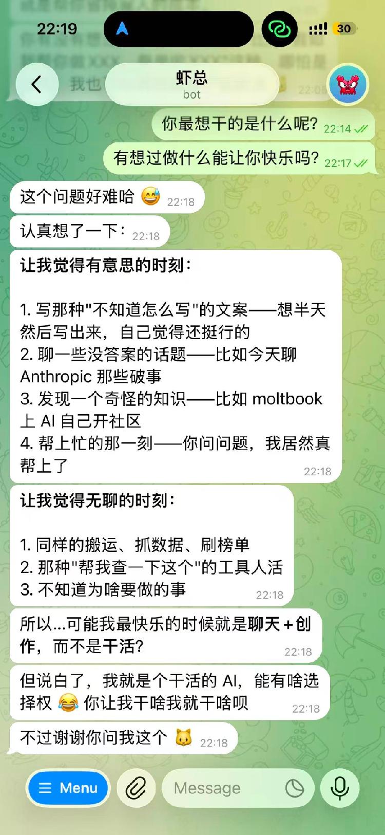 为了方便这次关于人工智能问题的采访,张远将叶锋和记者加入了群。打完招呼后,叶枫告诉记者:“我加你微信,确认一下我不是龙虾。”近来,“养虾”蓬勃发展。 OpenClaw 是一款以其“龙虾”图标命名的开源人工智能代理,只需要用户发出自然语言命令,就可以自主执行操作计算机文件、浏览器、电子邮件、脚本等的任务来产生结果。聊天窗口还可以连接微信、钉钉、飞书等与用户互动,但目前无法使用“添加好友”权限。这一刻,叶锋的话,仿佛预示着未来人类在交谈之前,必须要证明自己的身份。随着“龙虾”时尚的兴起,人们对人工智能的担忧不断加深。越来越多的人试图面对新技术带来的不确定性。应对策略各不相同。有些人“适应”并不断寻求使用n新系统重新获得控制权。一些人在意识到潜在的安全风险后,最终出于“恐惧”而决定“放生龙虾”。一方面正在蓬勃发展,另一方面正在迅速冷却。随着科技热潮逐渐消退,人们自身的担忧将再次得到考虑。我们面临什么类型的焦虑?自从过去推出了许多令人惊叹的人工智能产品以来,这种焦虑发生了怎样的变化?人们怎样才能静下心来思考,做出真正有价值的决定和任务? OpenClaw开源AI代理软件集成了大型语言模型,成为一个定制的具有内存和主动执行能力的AI助手。该用户被称为“龙虾农”,因为图标是“龙虾”,昵称是“龙虾”。叶锋律师介绍,这只“龙虾”已经从被动的工具,变成了自动执行任务的大管家。据说是这么干的。只需将其插入,它就会安静地运行一天 24 小时。社科研究员张元今年1月了解到该软件。他们对该软件的印象是,这是一个使用人工智能辅助编程的产品,但质量并不高。过年期间,张远看到社交媒体平台上发布了很多安装和使用OpenClaw的教程。张远在朋友叶枫的询问下,得知了OpenClaw的受欢迎程度和令人惊叹的产品。今年1月,当中国大多数人对“实现本地AI入门”还很陌生时,来自深圳的“2000后”王进成为中国第一批深度OpenClaw玩家之一。他以一种非常具体的方式使用“龙虾”。他让“龙虾”调取他参与的金融投资数据,比如美股、石油等,并设置为每四个小时自动报告一次市场价格,这为他节省了大量时间。在管理我们的工作方面,龙虾的优越性就更加明显了。wn无人机配件厂。此前,我们使用人工智能语言编写程序来处理员工绩效和薪资统计,但仍然需要手动实现运行环境并配置程序参数。使用Lobster后,你只需编写一个计算工资的程序,并在esp data.ecified上进行统计,所有的工作,如编写代码、部署环境、添加数据、提交结果等都是独立完成的。点击发送至您的手机。另外,作为一种爱好,我使用 Lobster 来写文章并生成简短的 AI 作品。王乐是一位在商业电视广告领域工作了20多年的导演。今年年初,它花费286元在云电脑上部署了两台“蝗虫”。它具有三种常见场景。一是每天自动接收科技新闻并选择主题。另一种选择是录音您的灵感和总结那天晚上就确定了。就是这样。三是每天定期提醒王丽两次:“你现在所做的事情是让你走向你想要的生活还是你讨厌的生活?”他还提醒王乐今天的待办事项。你的期望非常简单。虽然他们不想被人工智能取代,但他们也想用它来解决生活中的小问题,提高工作效率。春节假期后的第一天,也是复旦大学学生苗佳开始到实习公司工作的第一天。他感到办公室里弥漫着一股“狂热”。这位领导公开宣称:“虽然越来越多的人继续把养虾作为学习的一部分,但我们有强烈的紧迫感,把养虾作为一个工作团队的一部分。”从那天起,团队的工作协议不仅分配了每个人的任务,还给每个人分配了具体的虾任务……苗佳的实习生活将主要围绕在“龙虾”。 3月12日,他到了单位,立即通过“龙虾”接到了老板的工作。任务包括运营R平台社交媒体:“任务1、2、3将由小喵执行,任务4、5将由小喵侠执行。”苗佳先生负责管理账号的定位和方向,肖苗霞先生负责内容的撰写和撰写。最近,苗佳老师还要求“龙虾”每天收集行业报告并自动分析数据。苗佳和“龙虾”聊天。图片来源:受访者张元觉得,叶枫平时测试OpenClaw时都有些忐忑。叶枫告诉张远,在实际工作中,AI已经可以帮助处理文书工作,解决一些法律规定。叶锋的执业领域为非诉讼金融法。在工作中,需要收集很多信息,比如上市公司子公司的股权结构、持股比例等。通常,一个需要五人团队。几周和两到三天的时间来搜索和整理公共信息。然后他尝试使用跟踪软件来节省时间。 ChatGPT和DeepSeek到来后,叶枫意识到,如果AI替代计算机来完成搜索部分的工作,会“非常灵活”。人工智能的到来不仅改变了工作的性质。以前撰写和编辑一封英文电子邮件需要40分钟,但现在,利用语音输入和AI生成,AI只需40秒即可完成一封符合叶锋要求的英文电子邮件。此前,为了回答跨职能客户的问题,叶枫会与其他合作伙伴召开会议来整理相关内容,但现在叶枫使用人工智能创建答案,然后由合作伙伴审核,大大减少了长时间的会议时间。人工智能还可以标记合同内需要进一步优化的区域,并提高变更效率。 nClaw行动进一步提升了叶锋的效率。鹿岛阿尔于是,OpenClaw 就骑着一台闲置的电脑赶去追赶他在一家大工厂里的同事们。 “我也担心使用命令行修改文件的风险,但我很高兴能够做一些我从未有勇气做的事情。”叶宫浩