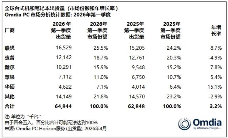 4月10日,国际数据公司(IDC)联合市场研究机构Omdia发布了今年第一季度全球PC市场报告。尽管统计数据不同,但两份报告显示出相同的趋势。 PC市场在第一季度实现温和增长,这可能是2026年全年的最高点。随着供应链重塑市场,今年PC价格将继续上涨。据IDC统计,第一季度全球PC出货量总计6560万台,同比增长2.5%。根据Omdia的最新研究,第一季度台式机、笔记本电脑和工作站的总出货量达到6480万台,同比增长3.2%。一季度个人电脑的增长并非需求的根本性复苏,而是短期因素综合作用的结果。 Omdia分析显示,制造商和渠道合作伙伴普遍预计零部件价格将继续上涨。nue上升,导致第一季度订单提前。与此同时,Windows 10更新换代周期持续推高企业的升级预算,春季Windows新产品和苹果OEM产品的一系列推出共同构成了这一波增长的三大驱动力。各行业巨头在市场份额方面表现的悬殊是本季度最直观的迹象。两家机构的数据显示,市场份额排名前五的分别是联想、惠普、戴尔、苹果和华硕。其中,联想以超过1650万台的出货量领先,市场份额超过25%,出货量同比增长超过8%。惠普是前五名制造商中唯一一家单位出货量下降的公司,出货量同比下降 4.9%,市场份额从 20% 下降至约 18.5%。得益于新款 MacBook Pro、MacBook Air 的性能,苹果市场份额突破 10%以及经济型 MacBook Neo。前五名厂商中,华硕的同比增长率最高,超过10%。它已成为一个快速成长的品牌。整体来看,PC市场日趋集中,除惠普外的前五名企业均实现增长,而“其他”类别出货量较去年同期有所下降,PC行业主要厂商正在加速侵蚀中小品牌的市场空间。分析师对未来几个季度个人电脑市场的表现充满悲观情绪。 Omdia 首席分析师 Ben Yeh 表示:“随着供应链压力持续加剧,第一季度的温和增长可能成为全年业绩的亮点。” IDC还确定,2026年剩余季度PC出货量将进一步下滑,市场将进入高压运行周期。 PC设备价格上涨也已成定局今年继续上涨。叶茂盛预计,从今年第二季度开始,内存和存储成本预计将比此前预期上涨更快、幅度更大,这将压缩PC制造商的毛利率,迫使他们将部分成本转嫁给渠道合作伙伴和终端客户。与此同时,centrAI数据的大规模建设正在减少消费市场的内存和存储供应。自 2025 年第一季度以来,内存和存储成本分别增加了约五倍和三倍。另外,虽然CPU价格影响较小,但仍形成分层压力。英特尔和AMD预计第二季度产品价格将上涨10%至25%。第二季度供应链可能会进一步紧张,制造商之间的分化可能会更加严重。 IDC认为,2026年将是市场份额重新调整的一年,每个PC人的韧性制造商的供应链以及内存等核心零部件的采购能力将面临严峻考验。制造商供应链的稳定性和基本部件的可用性是成功的关键,而覆盖整个价格范围的产品组合使其更能抵抗市场波动。 (中国经济新闻)